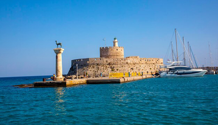 In the well-known Mandraki, at the entrance to the old port of Rhodes,you can see two columns with two deer statues on their top. Deer are the symbol of the cosmopolitan island and represent a female and a male deer, known as the elf and the doe.